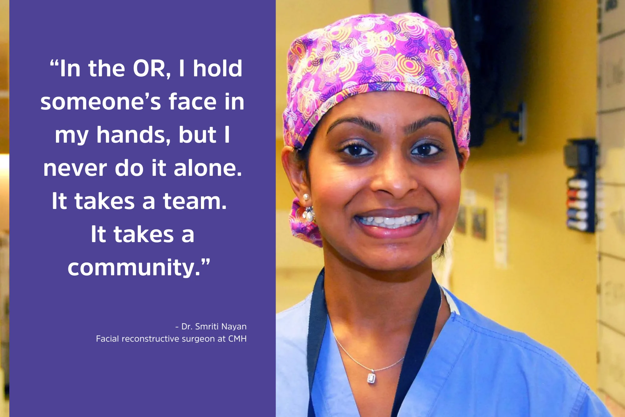 Over her 10 years at CMH, Dr. Nayan has seen firsthand how education, mentorship, and patient care are made possible by community generosity. “CMH might be smaller in size, but this community hospital is equally powerful in impact,” she shares. “This hospital is a place where care is personal. Where education is hands-on. Where service is shared, between professionals, families, and with the community.”